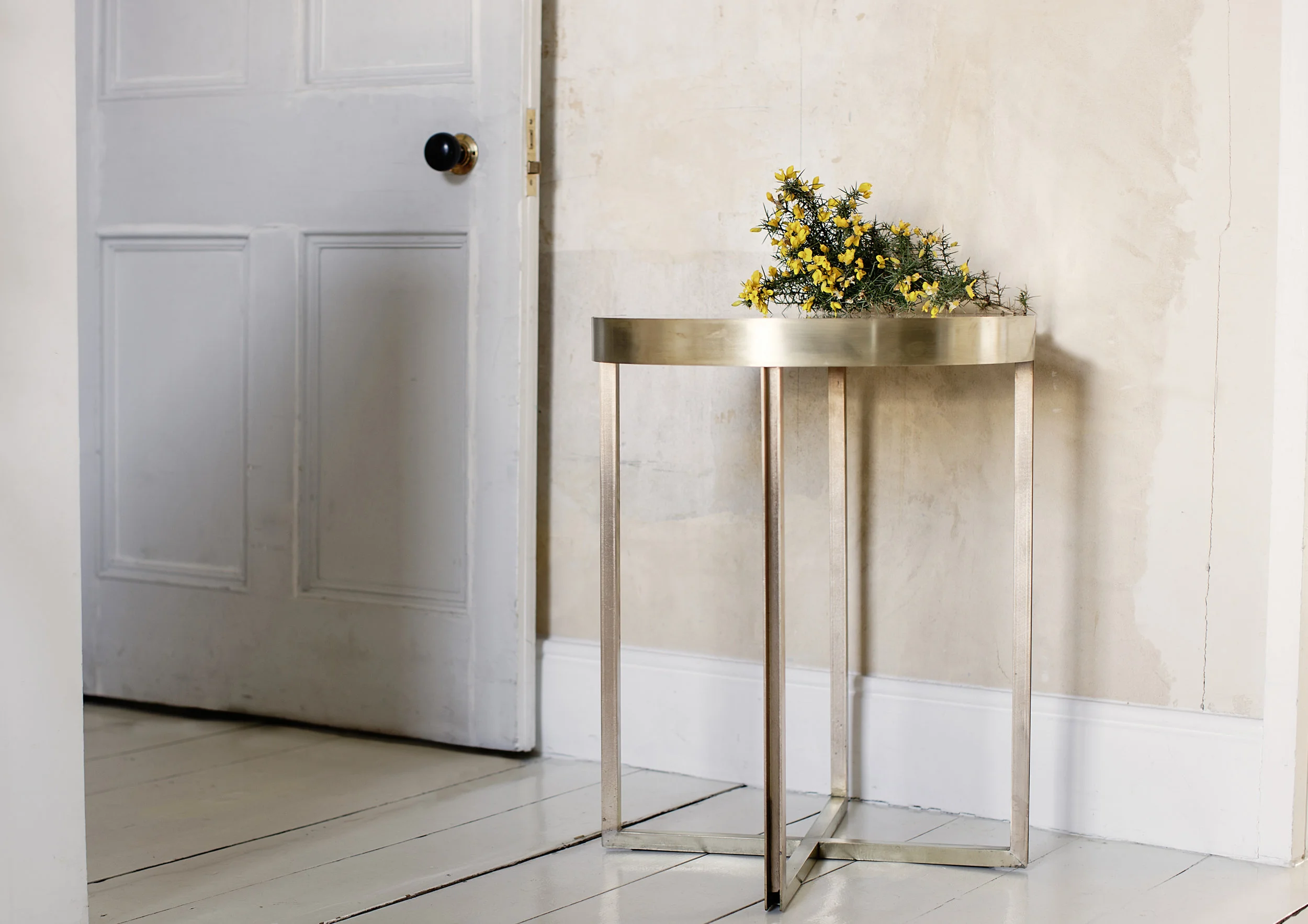 The signature Amato side table - sculptural finesse, an elegant round mirror top floats on brass legs.